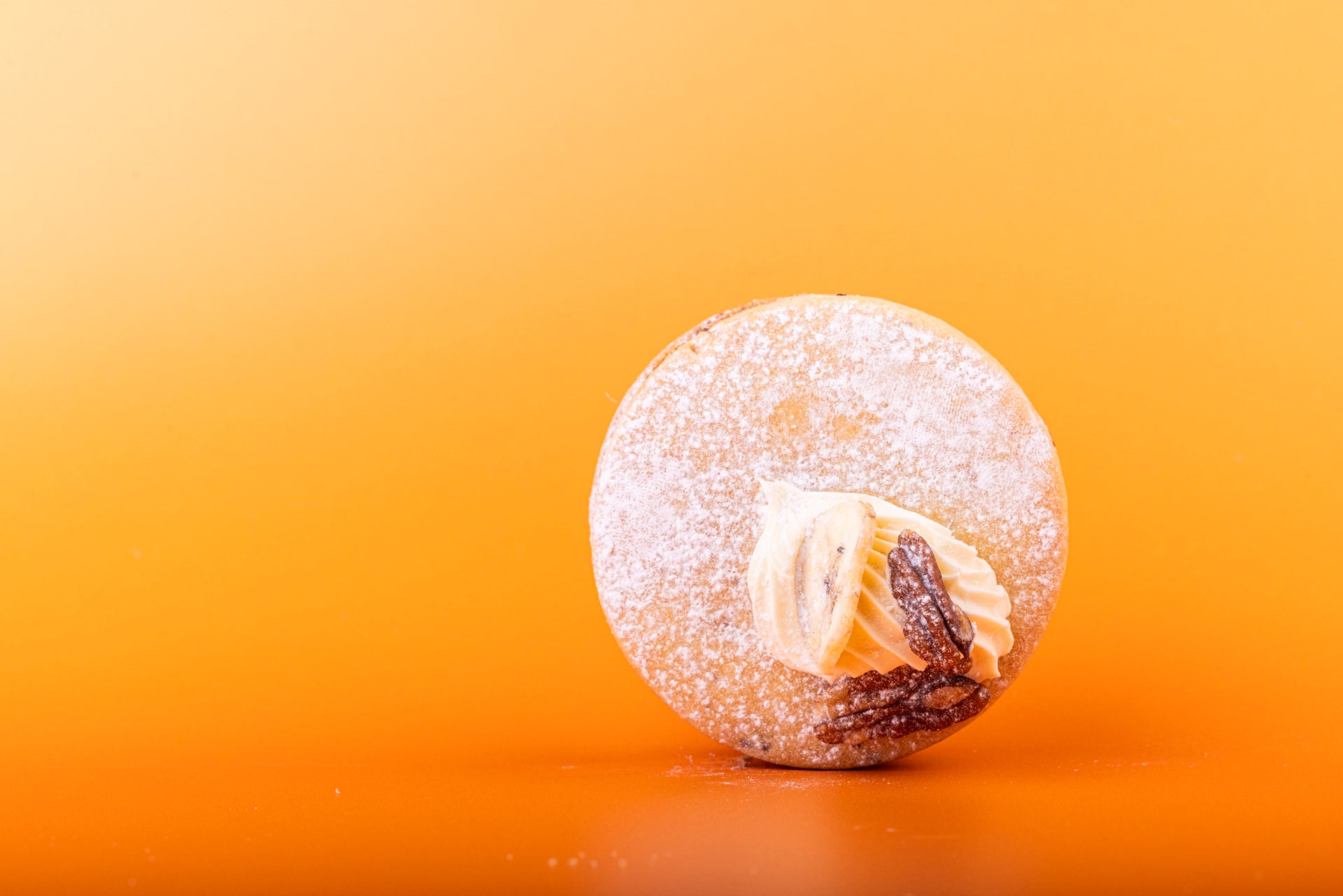 Our Banoffee & Pecan Empire Biscuit gives the traditional favourite a luxurious twist. Two buttery biscuits are sandwiched with creamy filling, then topped with a banana chip and a scattering of pecans. Sweet, nutty and indulgent with a playful banoffee finish.